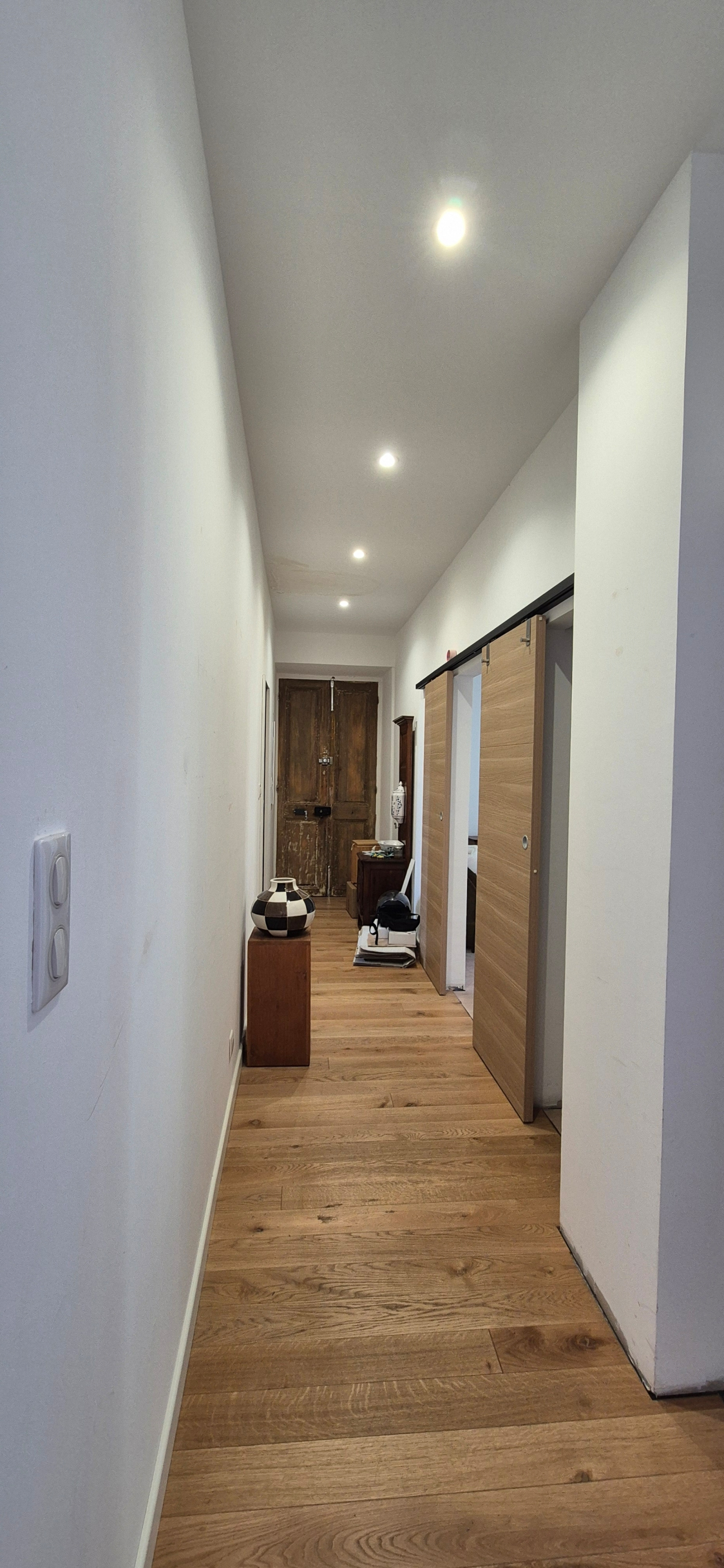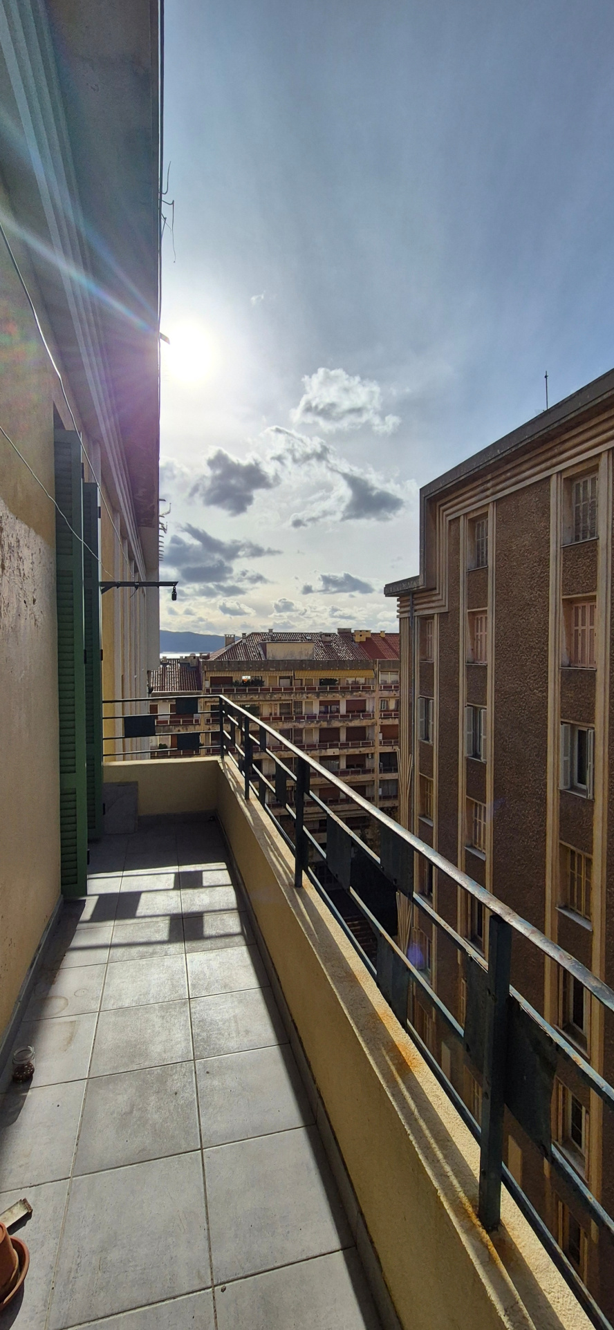 Au 6ème étage sans ascenseur, cet appartement se compose d'une grande entrée desservant une salle d'eau avec WC, de deux grandes chambres donnant accès au balcon, d'un dressing, d'une cuisine équipée ouverte sur le séjour.