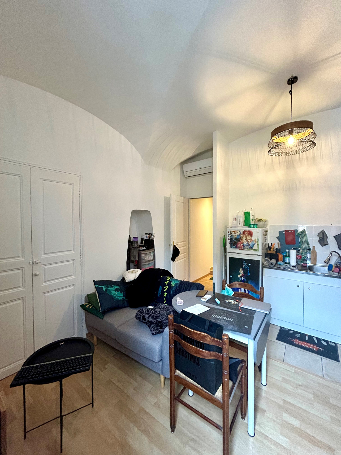 Il se situe à droite d'une entrée commune de deux appartements de type T2 et il est composé d'une entrée qui s'ouvre sur une pièce de vie avec salon climatisé et cuisine ouverte, totalement équipée, une grande chambre avec placard et une salle d'eau avec WC.