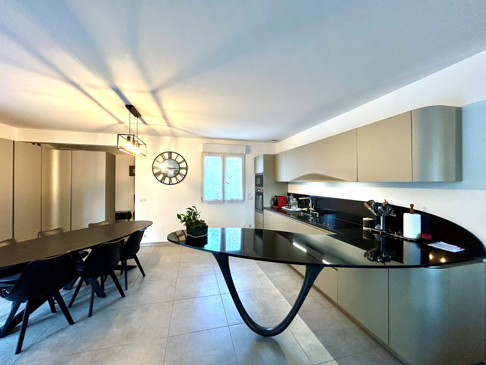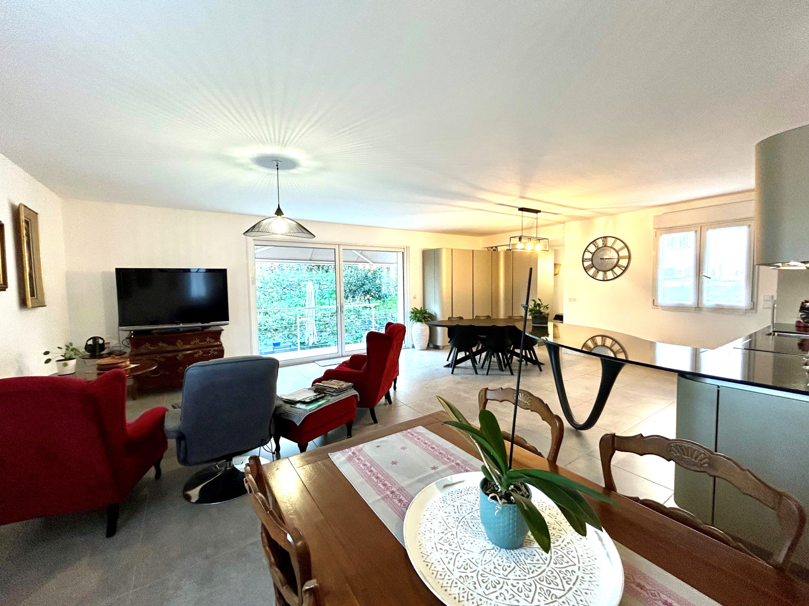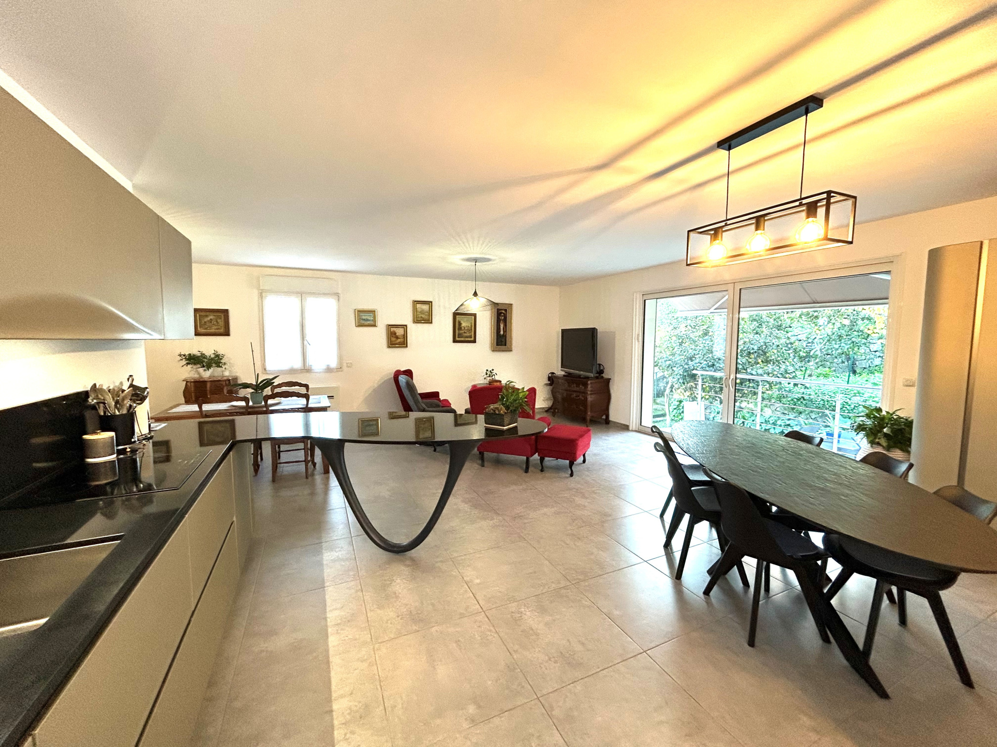 L'étage se compose d' une suite parentale avec placard de rangement et salle d'eau, d'un WC indépendant et d''un vaste salon avec climatisation et cuisine ouverte, totalement équipée de marque Italienne attenante à un cellier et accédant à la terrasse extérieure et au jardin.
