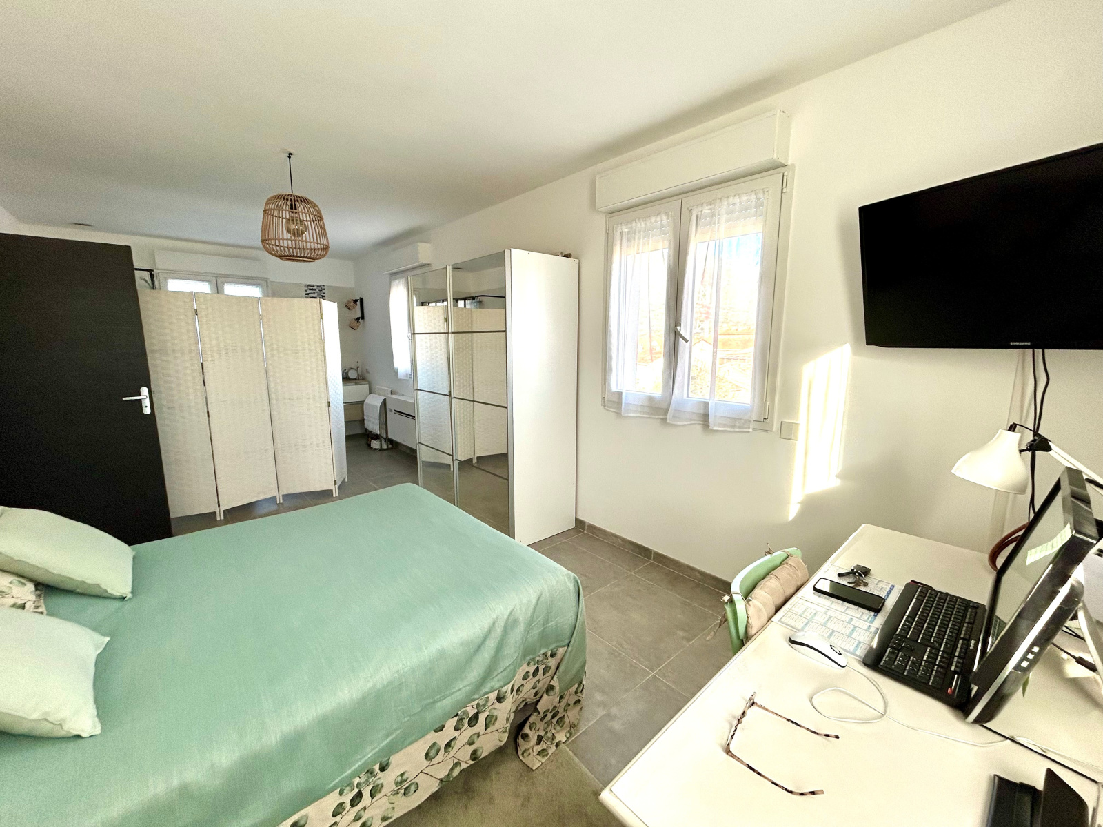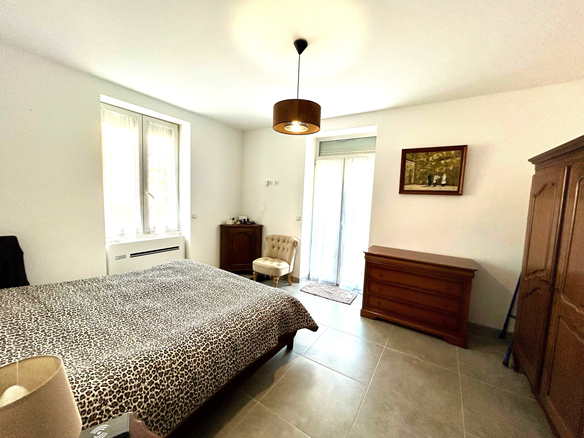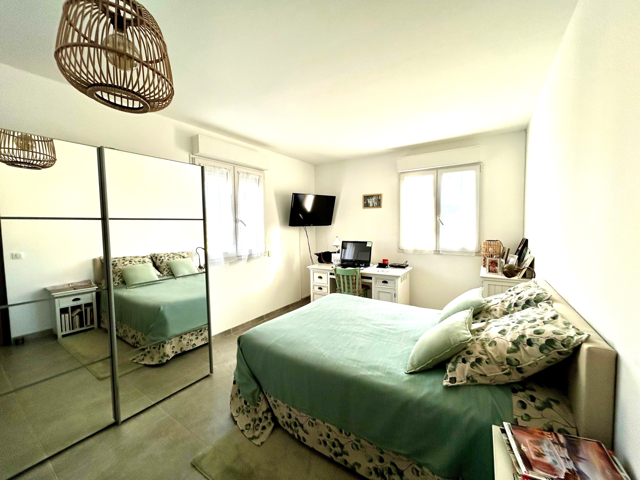 Cette maison sur deux étages est composée d'une vaste entrée avec placard et bureau, de deux chambres avec placard et climatisation attenantes à une belle terrasse, d'une salle de bain avec douche, baignoire et WC.